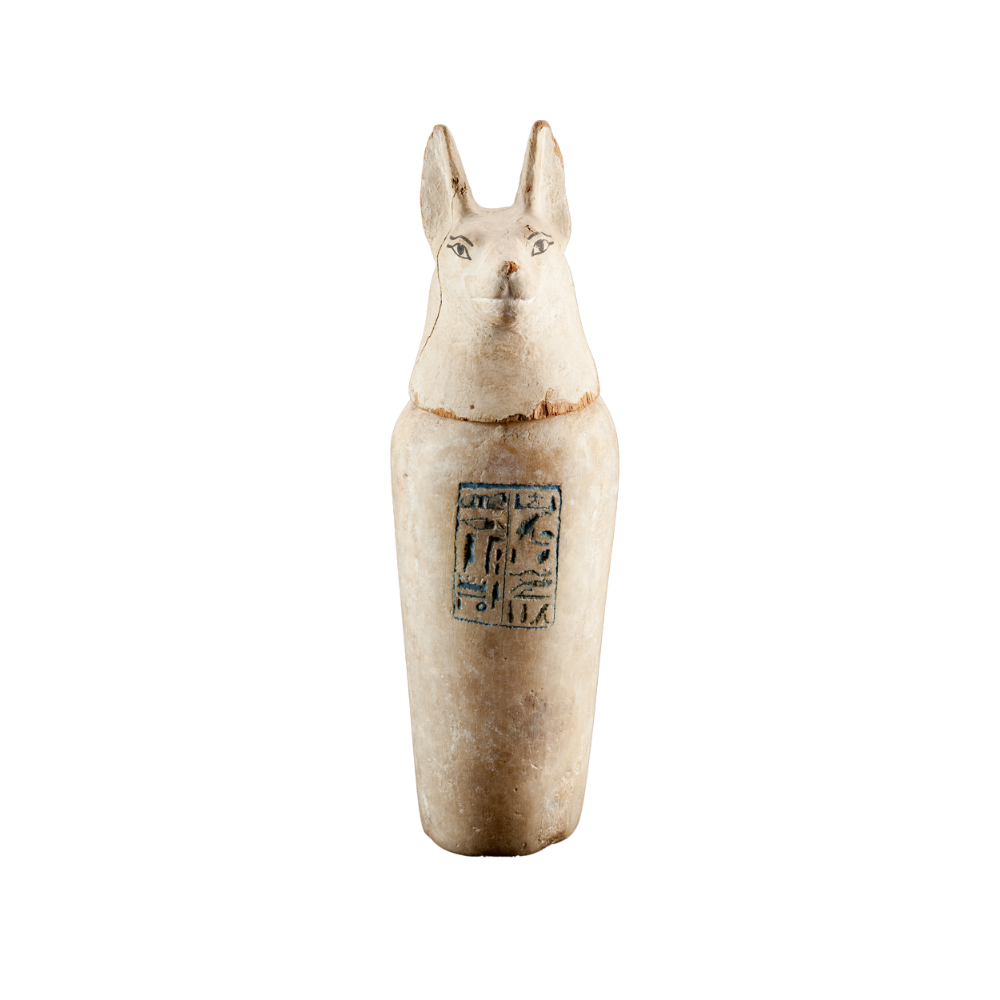 Vaso canopo dedicato a Duamutef, figlio di Horus con testa di sciacallo, custode dello stomaco del defunto.