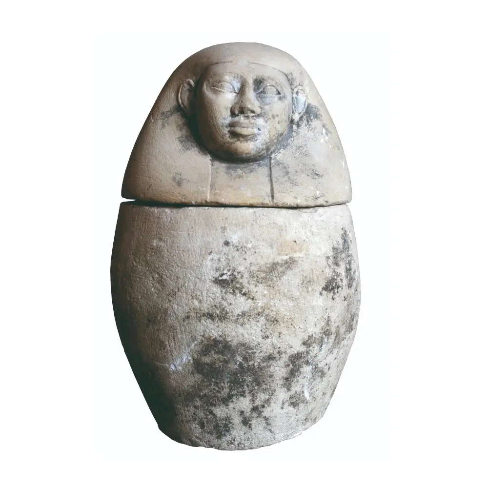 Vaso canopo in calcare dipinto con coperchio a testa umana, probabilmente del Nuovo Regno.