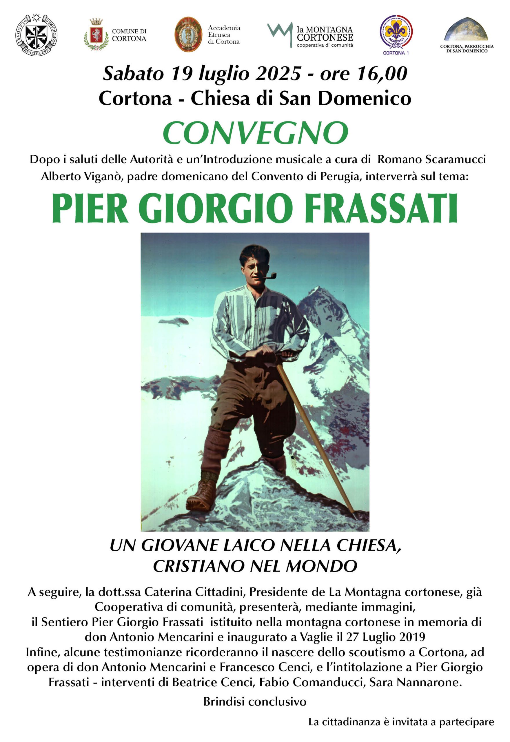 A seguire, la dott.ssa Caterina Cittadini, Presidente de La Montagna cortonese, giĂ  Cooperativa di comunitĂ , presenterĂ , mediante immagini, il Sentiero Pier Giorgio Frassati istituito nella montagna cortonese in memoria di don Antonio Mencarini e inaugurato a Vaglie il 27 Luglio 2019.