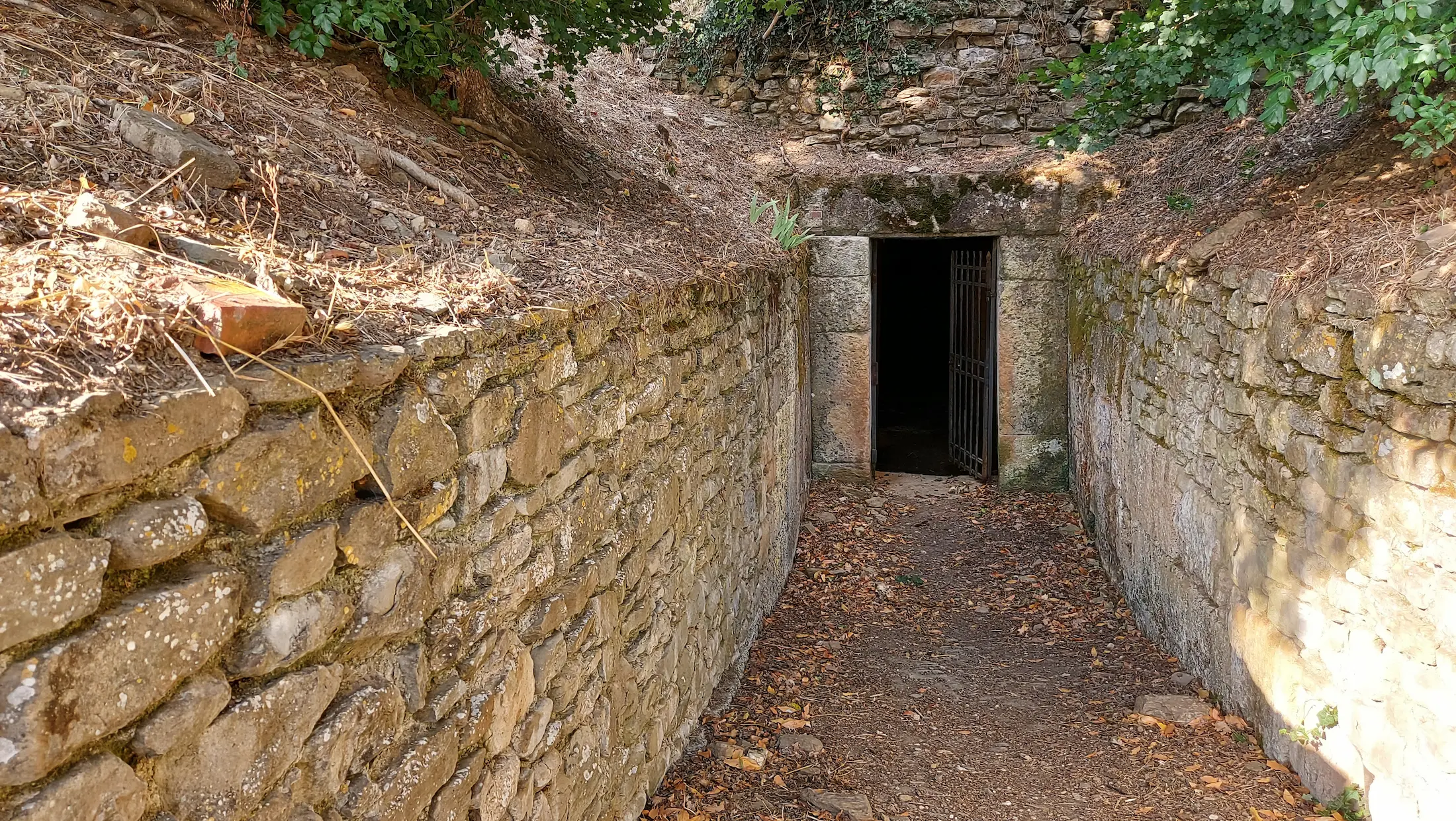 Alla sepoltura si accedeva attraverso un lungo corridoio d’ingresso (dromos), sulle cui pareti sono visibili molti blocchi di travertino (anch’esso proveniente da zone esterne a Cortona), in fondo al quale è una porta delimitata da stipiti e architrave monolitico, che immette in un doppio vestibolo quadrangolare; su di esso si aprono cinque camere funerarie, due per ogni lato ed una sul fondo; fra le celle del lato sinistro è una piccola porta che le collega. Sull’architrave di essa è un’iscrizione in caratteri etruschi che documenta la proprietà della struttura ad una gens cortonese vissuta intorno al IV-III sec.a.C., probabilmente proveniente da centri del limitrofo territorio umbro (Bevagna ?): si è pertanto certi del riutilizzo in età ellenistica della grande tomba arcaica.